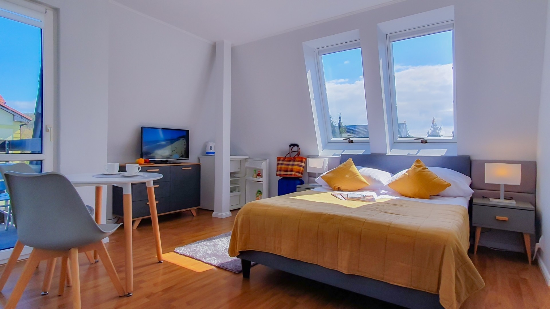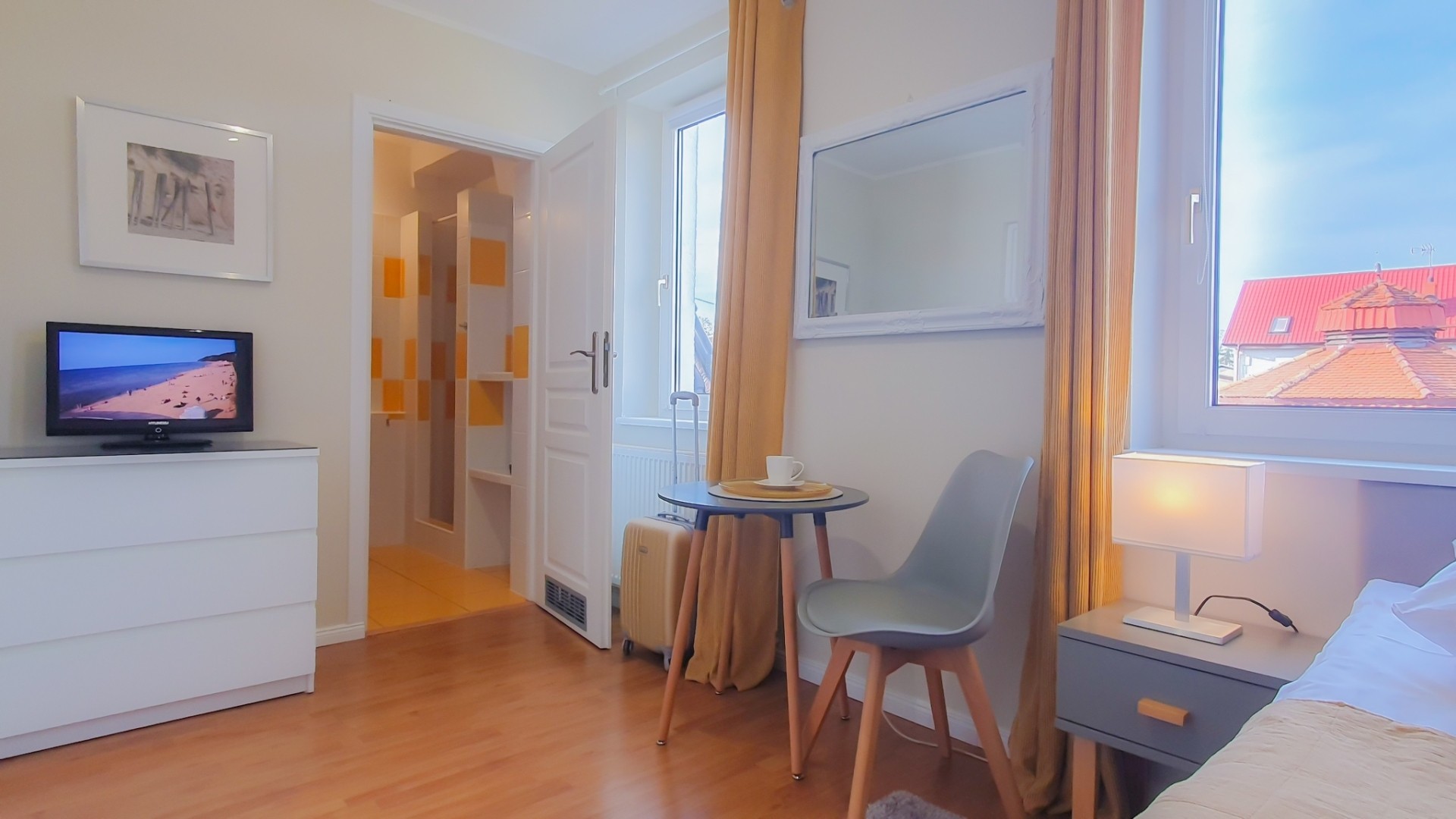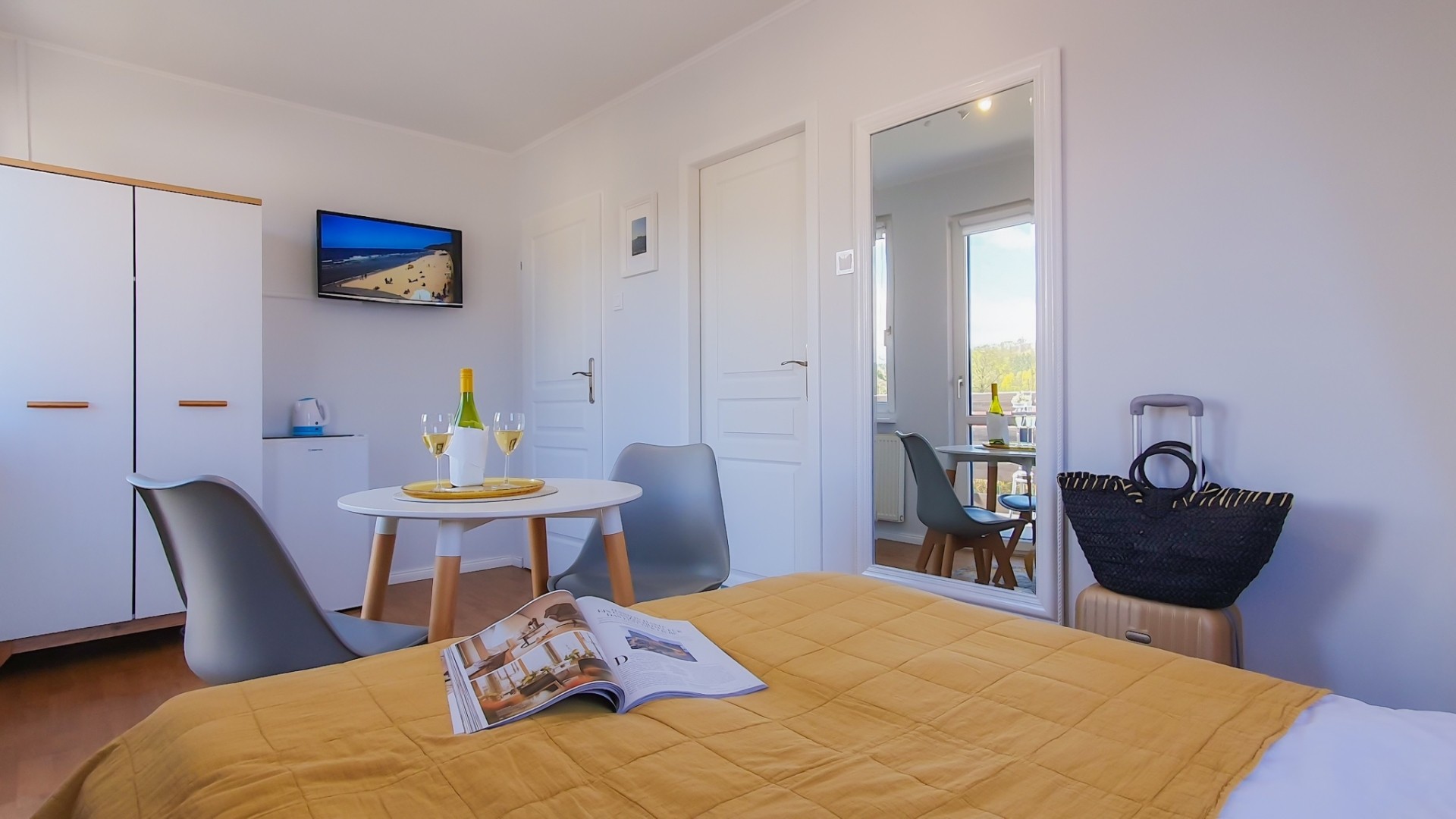W każdym pokoju, lodówka, zestaw do parzenia kawy i herbaty - czajnik elektr. i ekspres do kawy, Sat-Tv z płaskim ekranem i sprzęt plażowy – na plażę parawan oraz krzesełka plażowe.