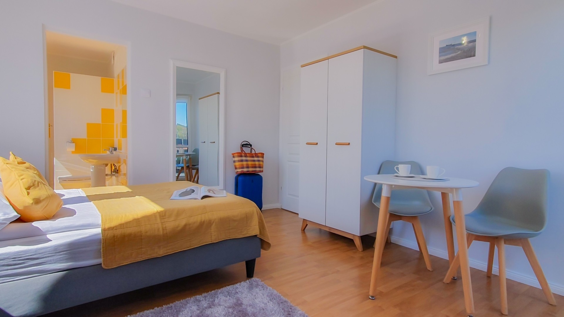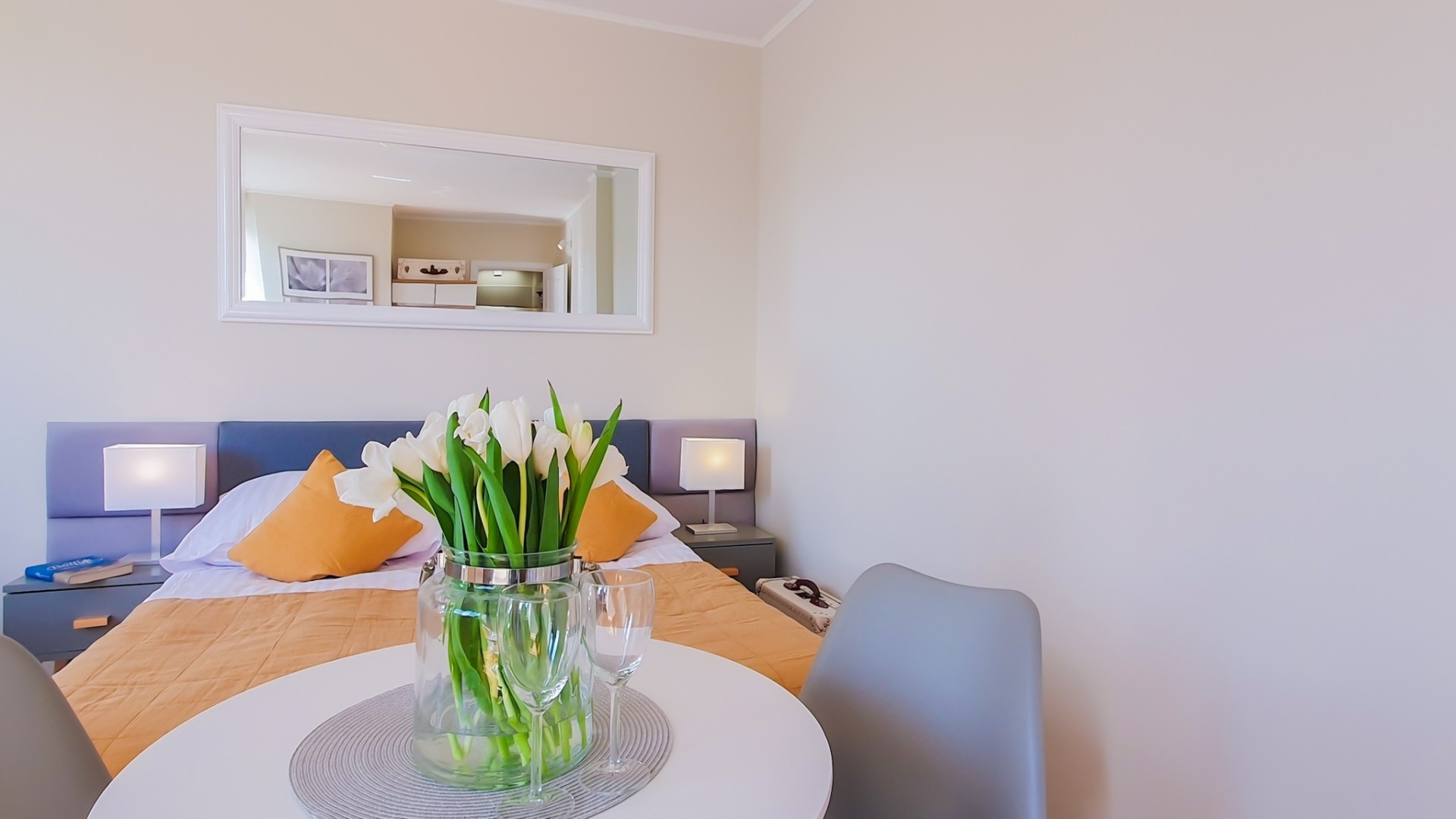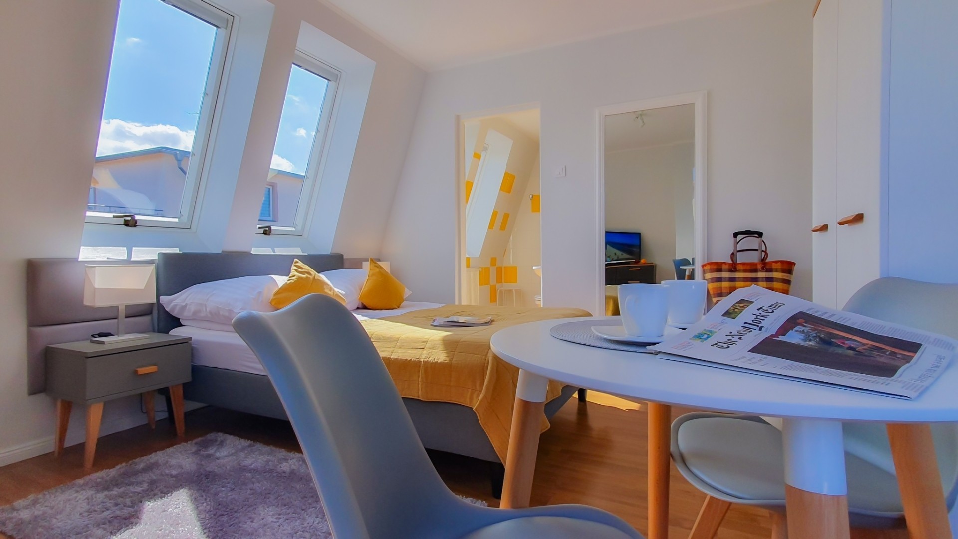 W każdym pokoju, lodówka, zestaw do parzenia kawy i herbaty - czajnik elektr. i ekspres do kawy, Sat-Tv z płaskim ekranem i sprzęt plażowy – na plażę parawan oraz krzesełka plażowe.